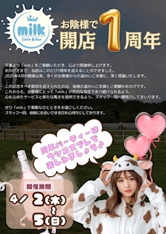 こんばんは~😳 かなです💛 本日25時から出勤します✨ なんとなんと!! 今日はmilkの誕生日🎂✨ おかげさまでオープン1周年を 迎えることができました🐄⸒⸒🍼 🤍🍼ありがとうございます🍼🤍 これからも居心地よく 楽しんで頂けるように 頑張っていきます🙌🤍 今後ともよろしくお願い致します🙇♂️💕 雨も吹き飛ばすくらいに みんなで盛り上がって行きましょう🎶 💛かな💛